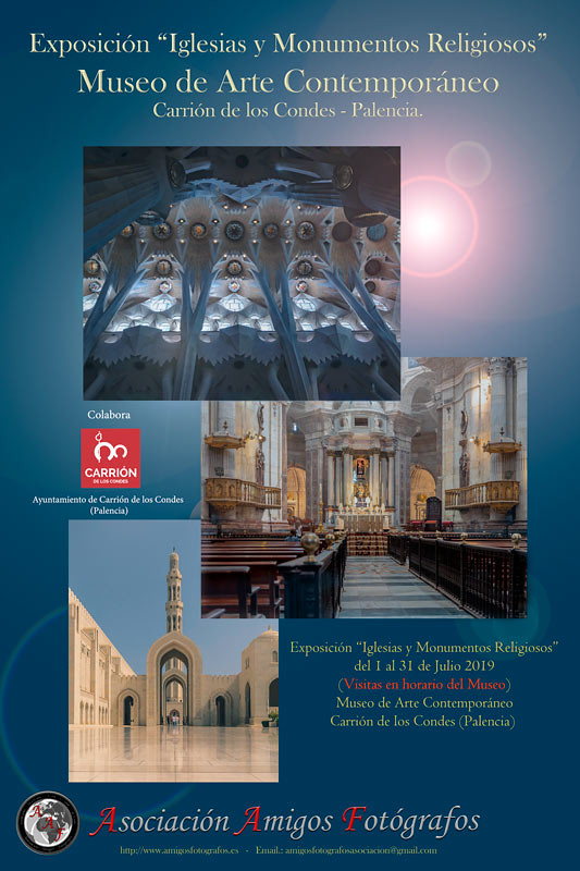 “Iglesias y monumentos religiosos” es una muestra de 25 fotografías en color con las que la Asociación Amigos Fotógrafos quiere poner en valor la majestuosidad de las catedrales castellanas, la rotunda simplicidad de las ermitas vascas, la sobriedad de los templos románicos cántabros, la transición hacia el más allá de las mezquitas árabes o el sencillo boato de las sinagogas hebreas, el recogimiento de las capillas andaluzas, su íntimo interior, su esplendoroso exterior, sus retablos y sus pórticos, todo ello unido presenta un universo de posibilidades dignas de ser disfrutadas en un proyecto fotográfico común que recorrerá los distintos espacios expositivos de nuestra geografía.