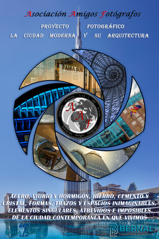 “La Ciudad Moderna y su Arquitectura” es una colección de 28 fotografías a todo color, en las que cada autor ha querido representar un edificio singular, moderno y audaz. A través del objetivo del fotógrafo podemos identificar alguno de estos sitios que a pesar de ser habituales a los ojos de la gente, enmarcados y expuestos en una sala y vistos en corta distancia nos hablan de la modernidad, de la valentía o de lo anticipado a su tiempo de sus creadores, nos relatan historias de aventuras y riesgos para conseguir que lo habitual y rutinario se convierta en inesperado y sorprendente, un poco lo mismo que sucede con Amigos Fotógrafos.